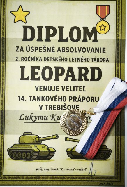 Druhý ročník detského letného tábora LEOPARD V termíne od 25. do 28.augusta 2025 sa v priestoroch 14.tankového práporu Trebišov konal druhý ročník detského letného tábora LEOPARD pre deti profesionálnych vojakov. Celkovo sa zúčastnilo 44 detí vo veku od 4 do 15 rokov. Formou vopred pripraveného programu aktivít, mali deti výnimočnú príležitosť vidieť, čo je náplňou práce ich rodičov. Inštruktori zapĺňali deťom čas po celý deň hravou a súťažnou formou, ktoré vzbudzovali dravosť a súťaživosť. Pre deti boli pripravené ukážky bojovej techniky a rôzne typy zbraní a taktiež zamestnania zo vševojskových predmetov ako je ženijná, spojovacia a zdravotná príprava. Riadiaci personál detského tábora za riadenia nadporučíčky Slavomíry Velebovej zabezpečil vystrojenie detí tričkami a šiltovkami s insígniami práporu. V rámci ukončenia detského letného tábora veliteľ 14. tankového práporu podplukovník Tomáš Korobanič ocenil deti diplomom a medailou o absolvovaní tábora a zároveň zhodnotil, že druhý ročník detského tábora LEOPARD sa ukázal ako vynikajúca príležitosť, kedy si deti odniesli nové zručnosti, kamarátstva a zážitky, na ktoré len tak nezabudnú. Na záver veliteľ zaželal deťom úspešný štart do nového školského roka.