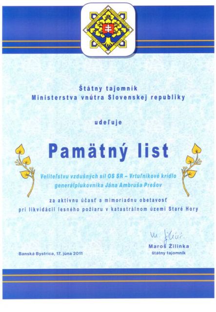 Dňa 17. júna 2011 sa na radnici v Banskej Bystrici uskutočnilo slávnostné udeľovanie rezortných vyznamenaní a ocenení Ministerstva vnútra SR za aktívnu účasť a mimoriadnu obetavosť pri likvidácii lesného požiaru v katastrálnom území Staré Hory. Štátny tajomník rezortu Maroš Žilinka udelil pamätný list Veliteľstvu vzdušných síl OS SR – Vrtuľníkovému krídlu generálplukovníka Jána Ambruša v Prešove a zároveň ocenil účasť Ozbrojených síl SR pri likvidácii požiaru lesného porastu v náročnom a ťažko prístupnom teréne a vysokú profesionálnu spoluprácu vojenských pilotov s modulmi leteckého hasenia HaZZ. Ocenenie za vrtuľníkové krídlo prevzal podplukovník Róbert Kleštinec.